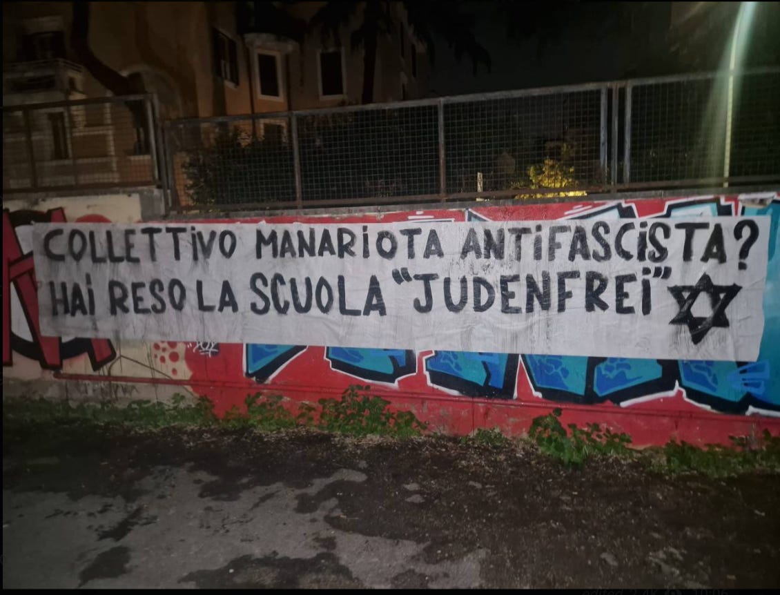 Il Liceo Manara a Monteverde ha all’interno un collettivo di sinistra molto attivo, anche contro il genocidio in Palestina, e molti studenti di religione e cultura ebraica. Quando facevo politica io le due cose non erano in contraddizione, anzi, ma sono passati quasi vent’anni e la comunità ebraica di Roma si è spostata a destra, l’Italia si è spostata a destra e Israele si è decisamente spostato a destra. E dopo il 7 ottobre le cose si sono ulteriormente esacerbate, con l’emergere di numerosi episodi di squadrismo a opera degli elementi della destra della comunità ebraica nella capitale (tutti passati assolutamente impuniti).
